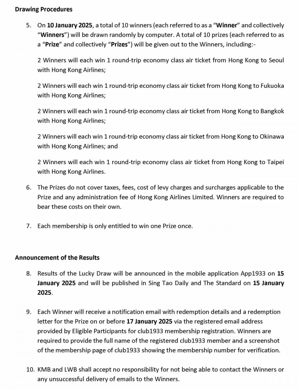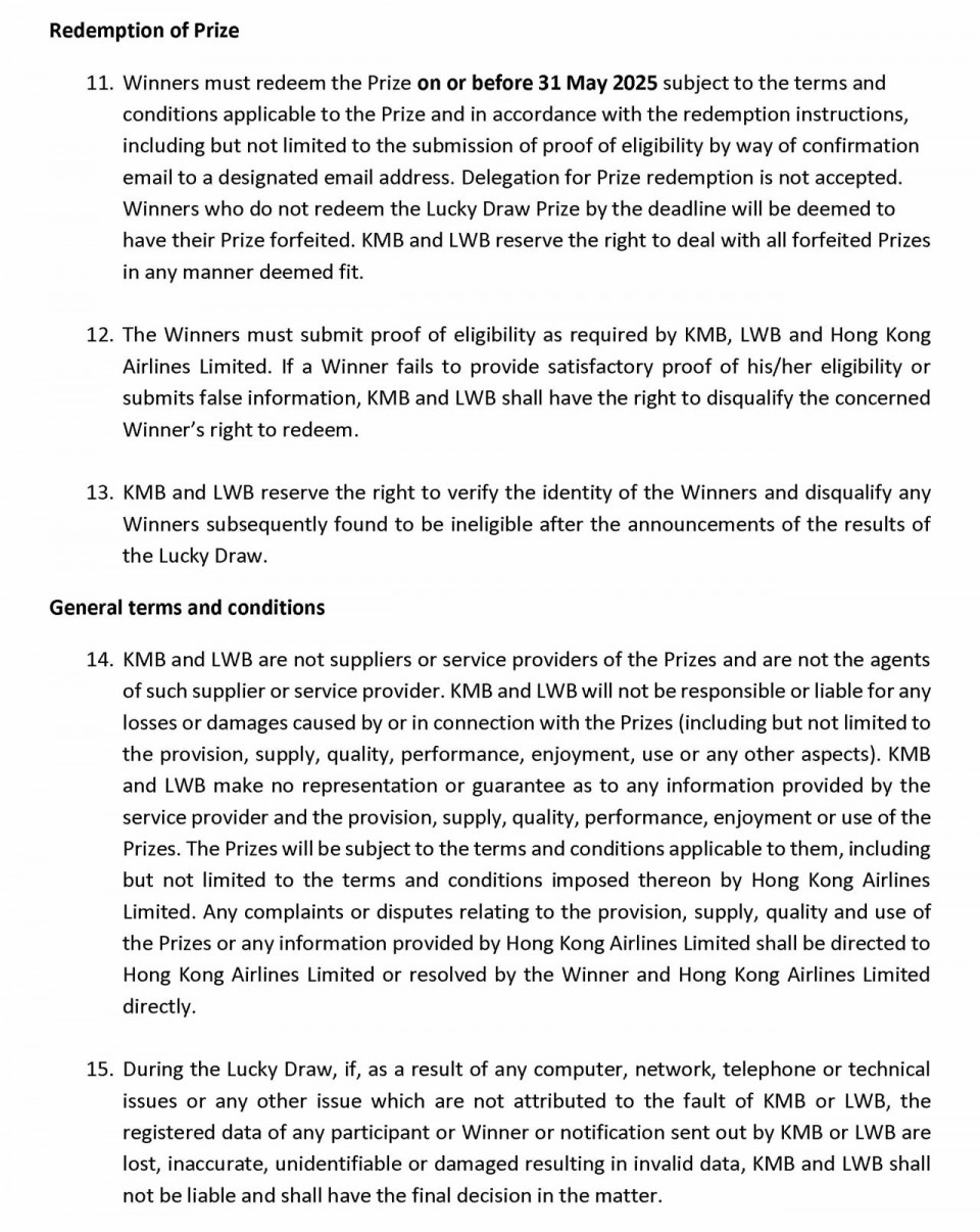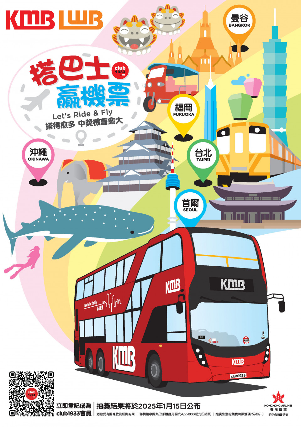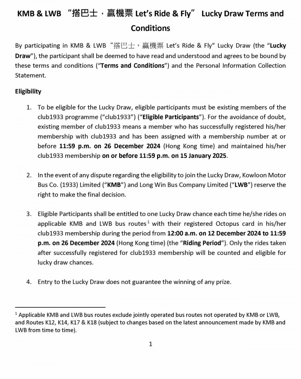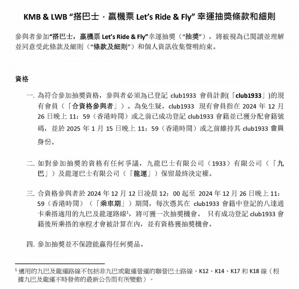 2024年12月12日至12月26日期間會員憑已登記八達通每搭一程巴士即可獲得一次抽獎機會隨時贏來回機票 (名額10名)